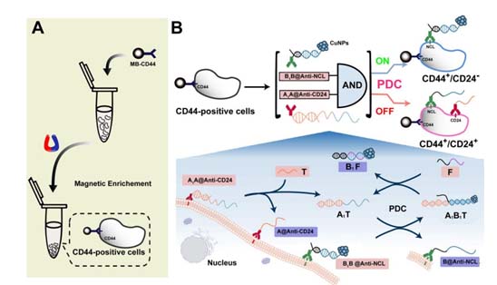 近日,365英国上市网分子识别与生物传感研究中心李根喜教授团队的研究工作取得两项重要进展,研究成果均以365英国上市公司为第一单位分别发表在国际著名学术期刊Journal of the American Chemical Society和Angewandte Chemie International Edition. 第一项成果是关于乳腺癌干细胞表型检测的新方法。乳腺癌是全球女性发病率、死亡率最高的癌症之一。乳腺癌干细胞是乳腺癌肿瘤中存在的小部分具有再分化和自我更新能力的癌细胞,与乳腺癌的转移与复发密切相关。为了精确区分乳腺癌中的干细胞亚群,研究团队提出一种基于原位可编程DNA回路(programmable DNA circuit,PDC)的电化学方法,通过在细胞膜界面DNA自组装构建具有特定拓扑结构的纳米核酸探针,准确呈现乳腺癌干细胞表面生物标志物的表达特征,实现了乳腺癌干细胞的超灵敏表型分析(如图1所示)。