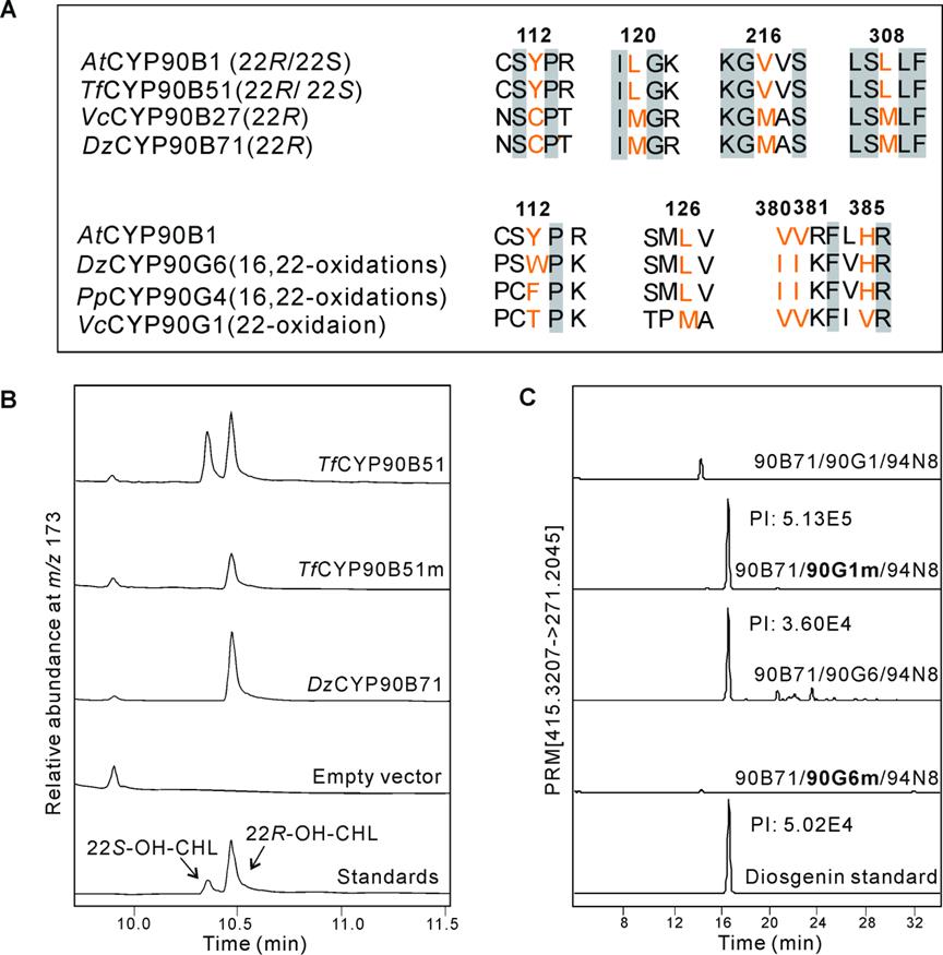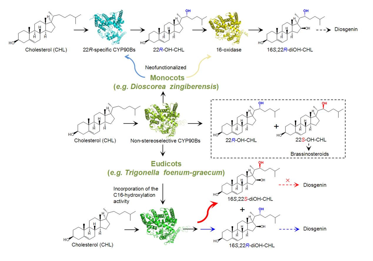 图1.单子叶与双子叶进化出两套不同的薯蓣皂素合成酶 课题组进一步利用蛋白定点突变技术,揭示了薯蓣皂素合成P450酶的功能演化历程,两种植物薯蓣皂素下游途径P450酶均起源于油菜素内酯合成CYP90s家族酶,仅通过CYP90酶催化腔中几种关键氨基酸的突变即可完成了酶的功能演化。在单子叶盾叶薯蓣植物中,P450酶功能进化得比较彻底,彻底丧失了油菜素内酯合成得功能,形成了专一的薯蓣皂素催化合成酶,而在双子叶葫芦巴植物中,P450酶进化相对懒惰随意,以致于形成了低活性的薯蓣皂素合成酶,这也许解释了自然界中为何单子叶植物合成薯蓣皂素的量远远高于双子叶植物的原因(比如单子叶薯蓣科植物是世界上主要的薯蓣皂素药源植物)。