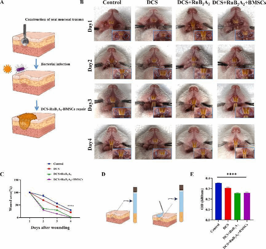 图1. 光响应抗菌水凝胶DCS-RuB2A2的制备及应用示意图。 团队制备的水凝胶基于十二烷基壳聚糖,这是一种疏松多孔结构,具有良好的止血和凝血作用,此外还能够激活血小板以促进伤口愈合。采用联吡啶钌交联十二烷基壳聚糖构建光响应抗菌体系(DCS-RuB2A2),在黑暗条件下具有较大的储能模量和孔隙率,适用于间充质干细胞的生长和呈递过程。这种湿润、柔软的3D培养系统有利于生长因子和细胞因子在伤口部位的释放。在可见光的照射下,DCS-RuB2A2中的吡啶甲醛基团从凝胶网络中脱落,并在壳聚糖的长十二烷基链的帮助下锚定在细菌膜上,发挥局部灭菌作用。经测序得到的差异基因主要富集于是细菌对上皮细胞的入侵、免疫系统、代谢、集中在细胞外基质中的炎症改善、中性粒细胞作用、细胞对生长因子的作用以及下游信号通路调节。这表明DCS-RuB2A2-BMSCs改善了细菌诱导的感染,减少了BMSCs旁分泌效应引起的炎症,通过调节细胞因子改善了伤口微环境,并促进了伤口修复(图2)。该系统具有良好的生物相容性和广谱抗菌性能。此外,该光响应抗菌水凝胶体系与间充质干细胞的抗炎和促进修复作用相结合时,在短时间内修复口腔粘膜缺损。研究表明,这种多功能光响应水凝胶具有临床应用价值,并进一步支持口腔粘膜疾病创新疗法的研发。