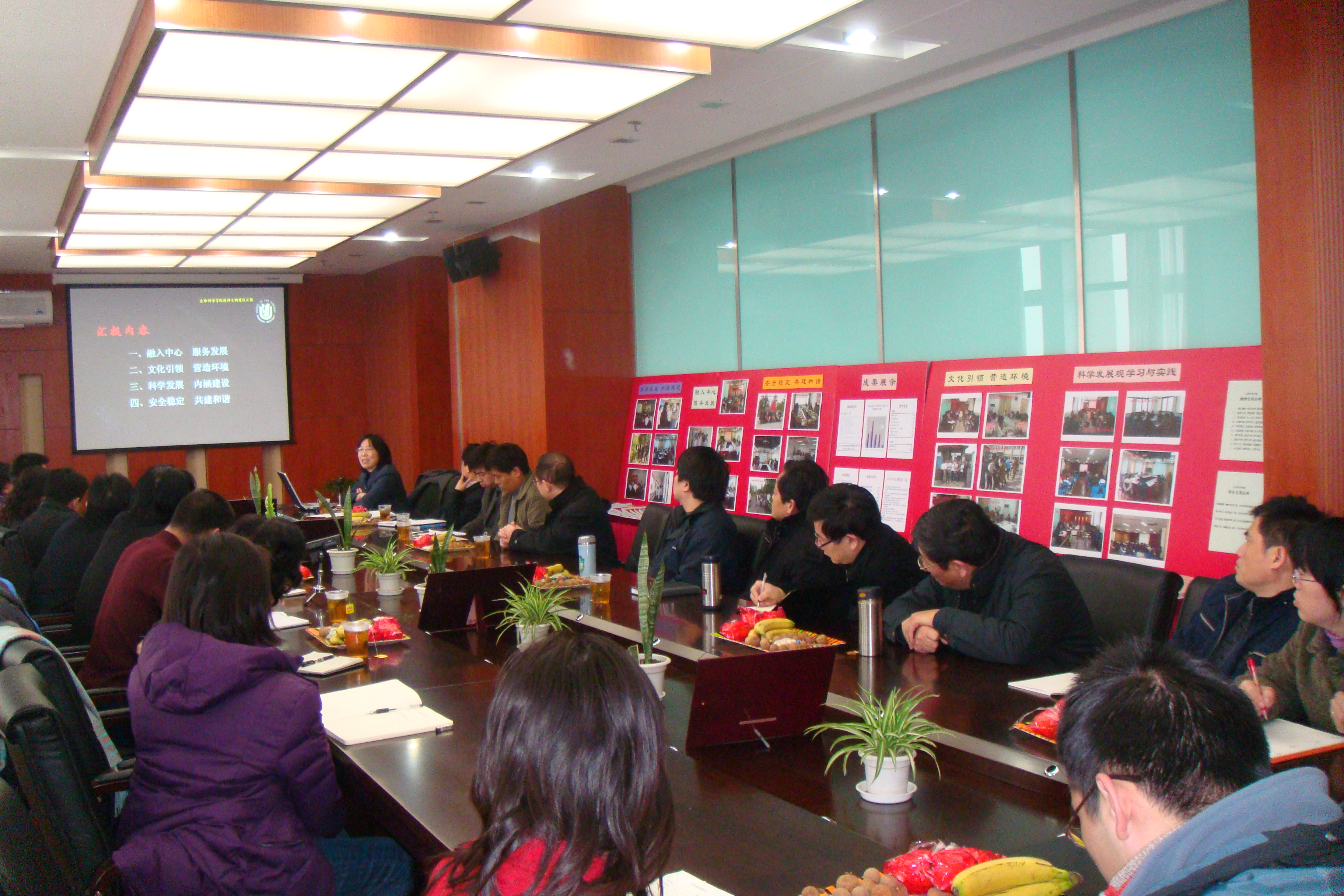 会上,李红同志首先做了汇报,她结合学院的特色组织文化建设,从"融入中心,服务发展"、"文化引领,营造环境"、"科学发展,内涵建设"、"安全稳定,共建和谐"四个方面对学院近两年来所开展的精神文明建设工作进行了总结,同时也提出了今后的努力方向,学院党总支将以科学发展观为统领,继续以中心工作为切入点,树立统筹兼顾的系统观,充分调动资源,创造优势,惠顾民生,推进学院两个文明建设,营造积极向上、和谐的组织文化。