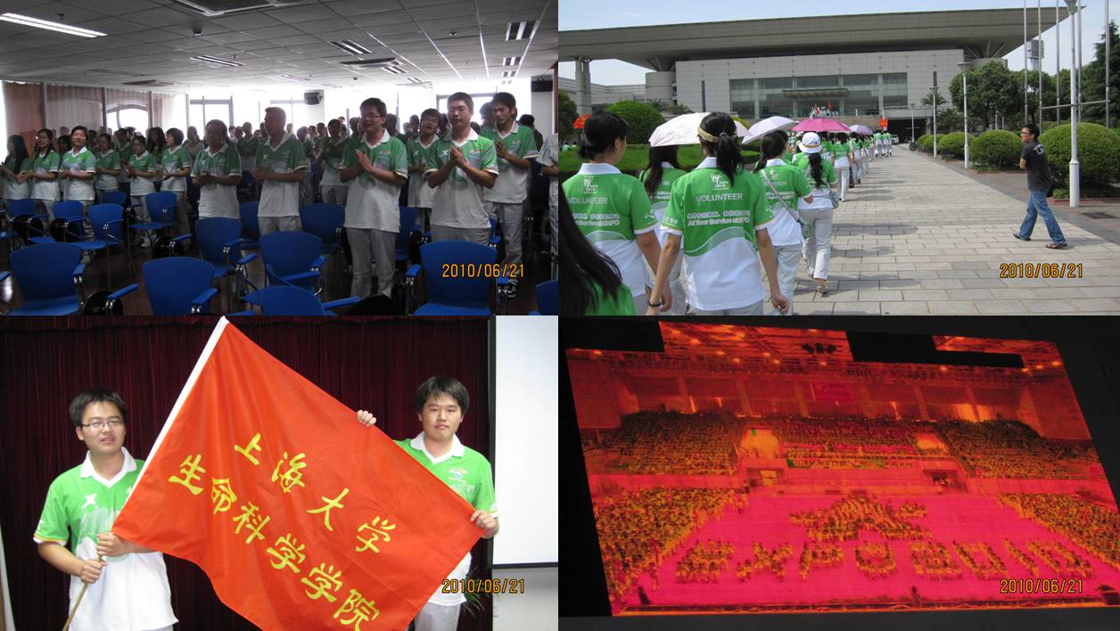 下午3点整,各师生入场完毕了,可以清晰地发现,会议现场身穿蓝色志愿者服的城区志愿者们组成了可爱的海宝形象,而身穿绿色志愿者服的园区志愿者们则组成EXPO2010的形状。首先进行的就是口号传递环节,在一浪高过一浪的传递过程中,生科的学子们高声地喊出了自己的心声:"生命赞歌、唱响世博!世博我们赞美你!生命加油!" 然后,轻松欢快的海宝舞正式地拉开了本次大会的序幕。会议上,众多领导都发表了感言,感人的画面也在不断上演,志愿者们都受到了极大的鼓舞。最后,校党委书记于信汇做了动员讲话。希望同学们要牢记使命,在服务中展现风采、传播世博理念;要磨练品格,在服务中增长才干、践行志愿精神;要淡泊名利,在服务中净化心灵、探寻人生价值。 通过参加此次誓师大会,生科的世博志愿者们又进一步地了解了自己所要肩负的重任。同时,大家也都充满了信心,会努力成为低碳世博的先行者,文明观博的倡导者,城市精神的传播者;将不畏困难,真正展示上大学子乐观向上的活力、海纳百川的胸襟、自强不息的精神和勇于担当的气魄,为世博会书写绚丽的篇章。