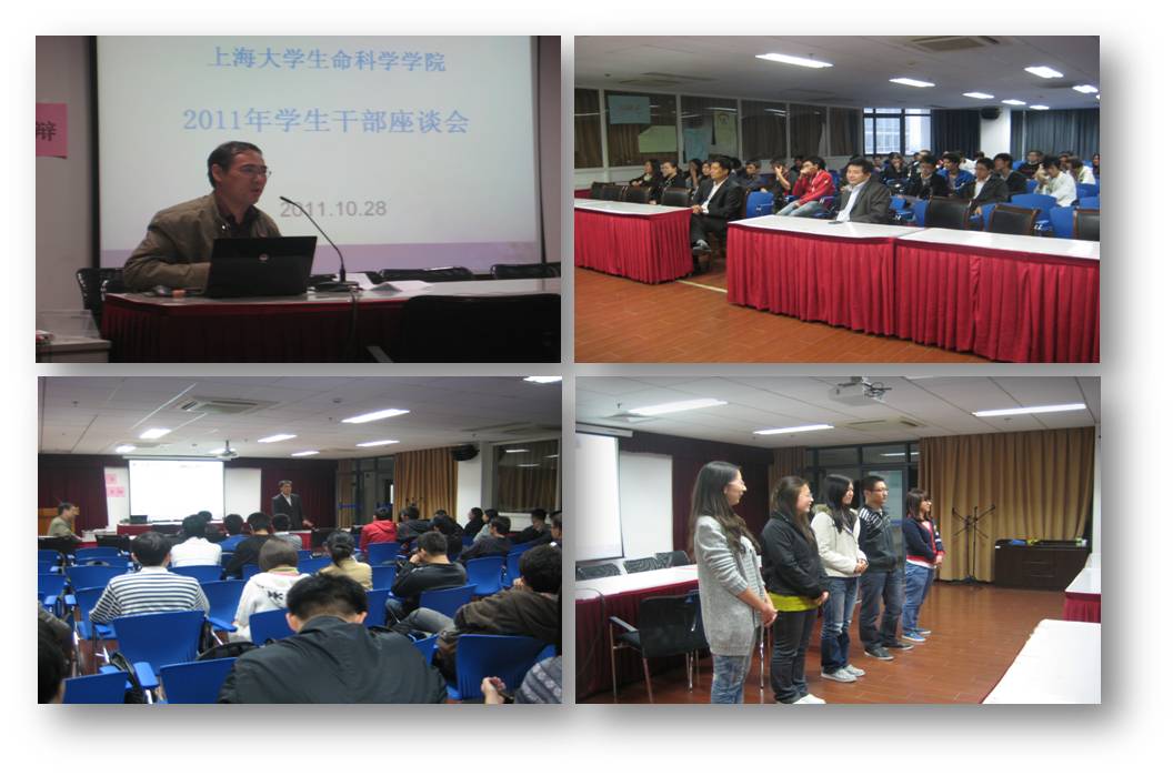 10月28日17:00,生命学院2011年学生干部座谈会在东区生命大楼700会议室顺利召开。参加此次座谈会的领导老师有学院党委书记沈忠明、副书记邓志瑞、原学院副院长现365英国上市公司学科办副主任陈付学、研究生专职委员苏洁。·我院上届和本届本科生团委、学生会和学生社团,上届和本届研究生党总支、团总支、研究生会主要学生干部参加了本次会议,会议由邓志瑞老师主持。