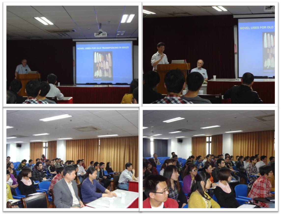 宋任涛教授首先简要介绍了Dooner教授的研究方向,随后Dooner教授就新型转座子在玉米研究中的应用,介绍了他所在的研究小组在玉米基因组研究中取得的成果。他指出转座子是基因组中一种移动序列,可以用于基因突变等的研究。Dooner教授的研究团队通过改造天然的AC转座子,克服了天然转座子在使用上的不足,并通过转基因活动了分布于染色体的整体系统,可以更有效的用于基因突变的研究。报告结束,Dooner教授与全体师生就转座子研究问题进行了深入的交流讨论。他耐心细致地回答了老师和同学们提出的问题。Dooner教授严谨的科学思维和专业的科学知识,感染了在场的全体师生。报告会在热烈的掌声中落下帷幕。