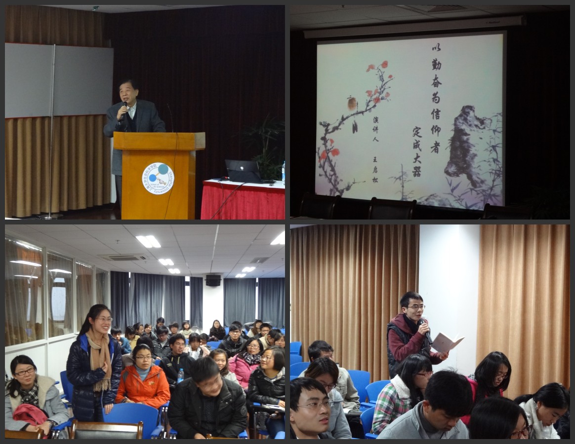 王教授的报告从他的学生时代展开,他带领研究生回顾自己是如何从一个问题小孩变成一个勤奋好学的人并取得优异成绩的方法,他那"三高"的学习方法给学生带来了很大的启发。随着报告内容的深入,王教授讲述了他的科研生涯,他说在他的一生中最正确和最勇敢的决定就是他离开了中科院生物化学研究所,并在众多邀请他前去教学指导的高校中选择了复旦大学遗传所。"如果我不离开生化所,我相信,我的才能不可能发挥得那么淋漓尽致,我的科研成果不大可能那样亮丽,我也不可能拥有那么多的耀眼头衔,也许我的后半生可能是极其平淡的。"王教授如是说。