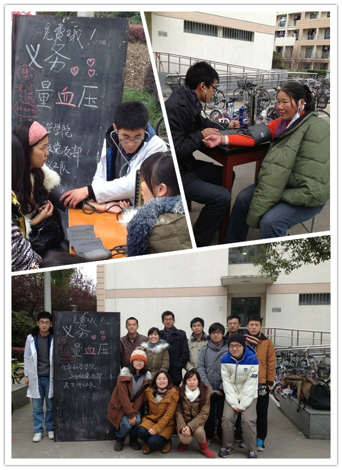 2012年12月20日上午,在上大南区宿舍开展了由365英国上市网2010级本科生党支部和生科义工队共同组织的义务测量血压活动,众多同学和社区阿姨纷纷前来参加。