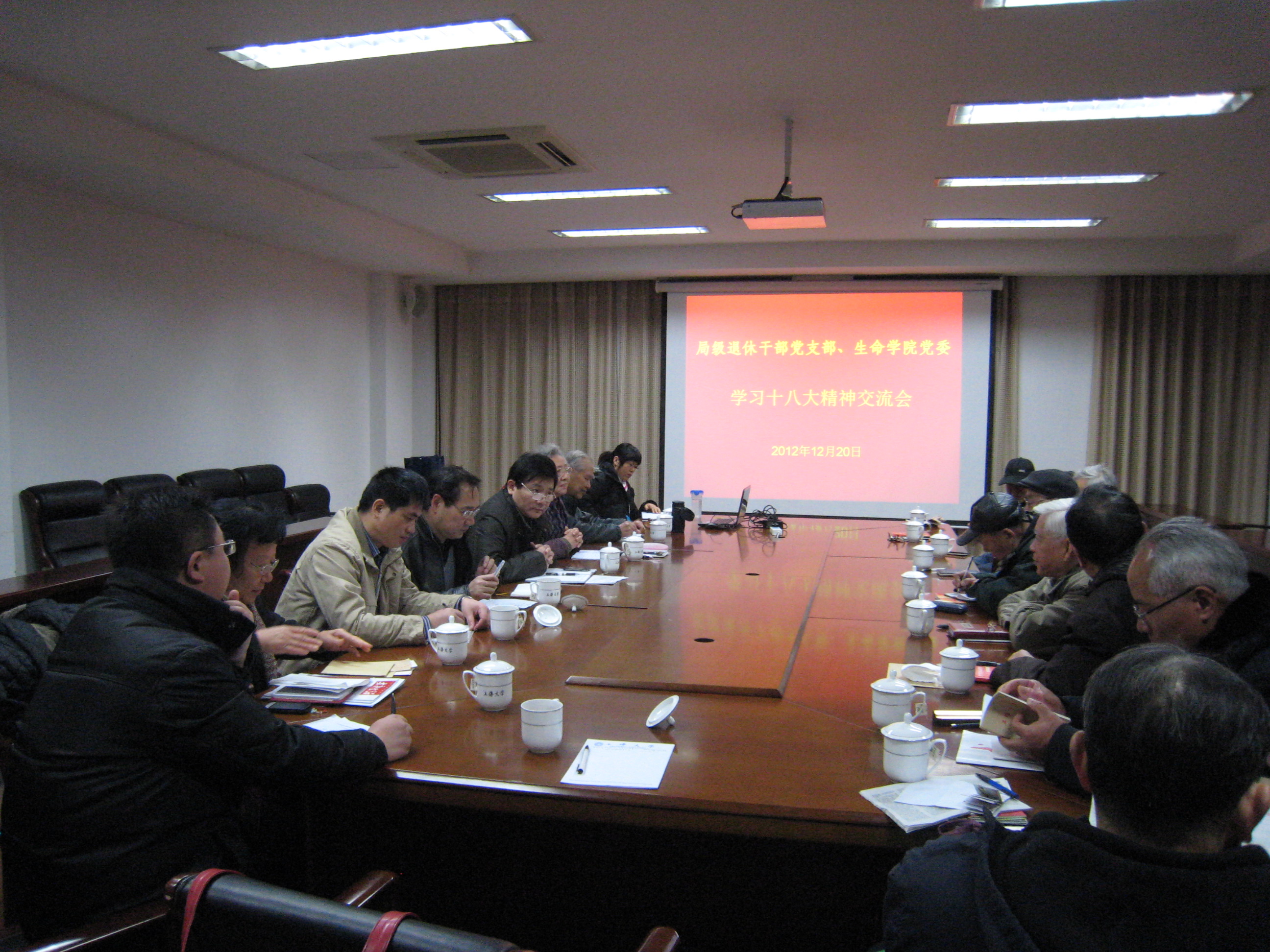 2012年12月20日上午9点,生命学院党委与局级退休干部党支部在延长北大楼208室举行十八大精神学习交流会,参加会议的有局级退休干部党支部的14位党员同志以及生命学院党政班子、中心组成员。会议由局级退休干部党支部杨慧如和生命学院党委书记沈忠明共同主持。