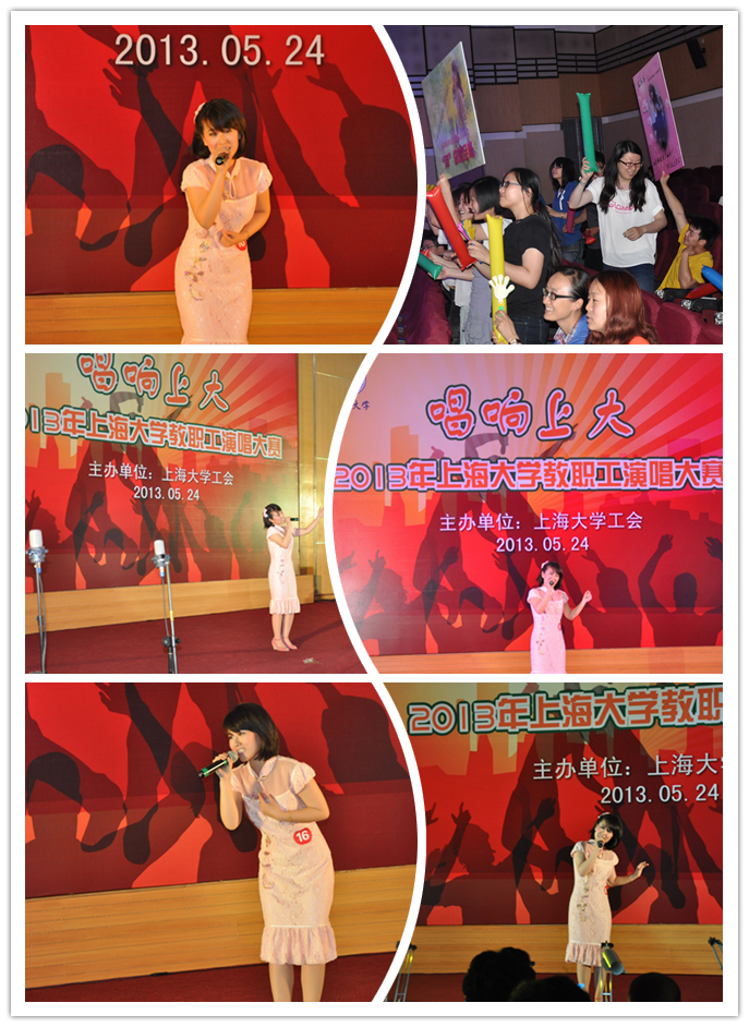 在正式比赛前,任老师在繁忙的工作之余积极练歌、准备妆容和服装,抱着非常认真和努力的态度参与本次工会活动。在今天下午的比赛中,任老师甜美的嗓音和稳健的台风征服了在场的评委和师生观众,获得了热烈的喝彩。由学院工会教师、学生组成的助威啦啦队也非常给力,体现了生命学院团结一心、富有创新的集体形象。最后,任老师也不负众望,获得了歌唱大赛三等奖,并且喜获上大教职工"十大歌手"称号,校工会姜副主席评价是:是整场比赛最优雅、最委婉、最动人、最亮丽的歌手。我们为任老师而骄傲,对此表示热烈祝贺。