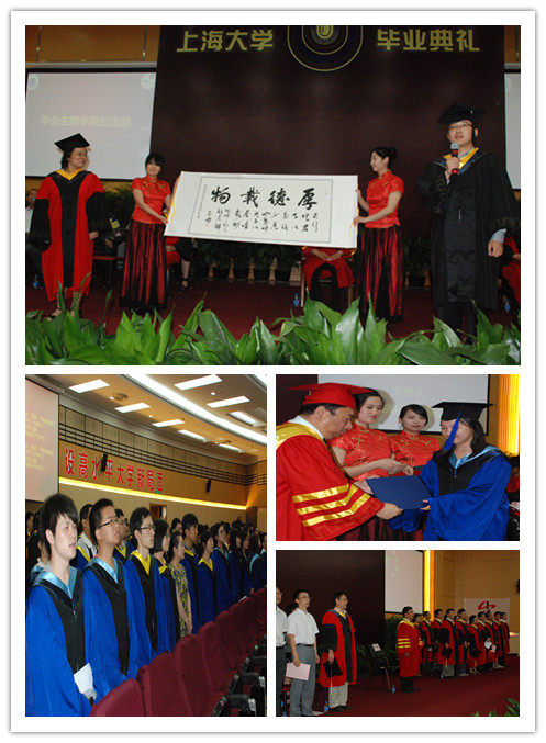 在最隆重最激动人心学位授予仪式过程中,主礼教授吴松副校长为学位获得者拨流苏、颁发证书,宋任涛教授为毕业生发贺信,邓志瑞副教授给毕业生赠送纪念品,并与毕业生分别合影留念。学位授予仪式之后,现场播放了本科生毕业视频,回顾了本科生大学四年的美好时光。本科毕业生代表刘洋在发表感言时表示,"毕业并不代表着结束,而是新的征程,毕业生要将自己所学为社会做出贡献"。现场播放的研究生毕业生纪念视频,展示了毕业研究生与本科生不同类别的风采。硕士毕业生代表谢菲同学在发言中说到,"感谢学校学院和老师的栽培,人生因为有上大的这一段时光而显得格外完美"。