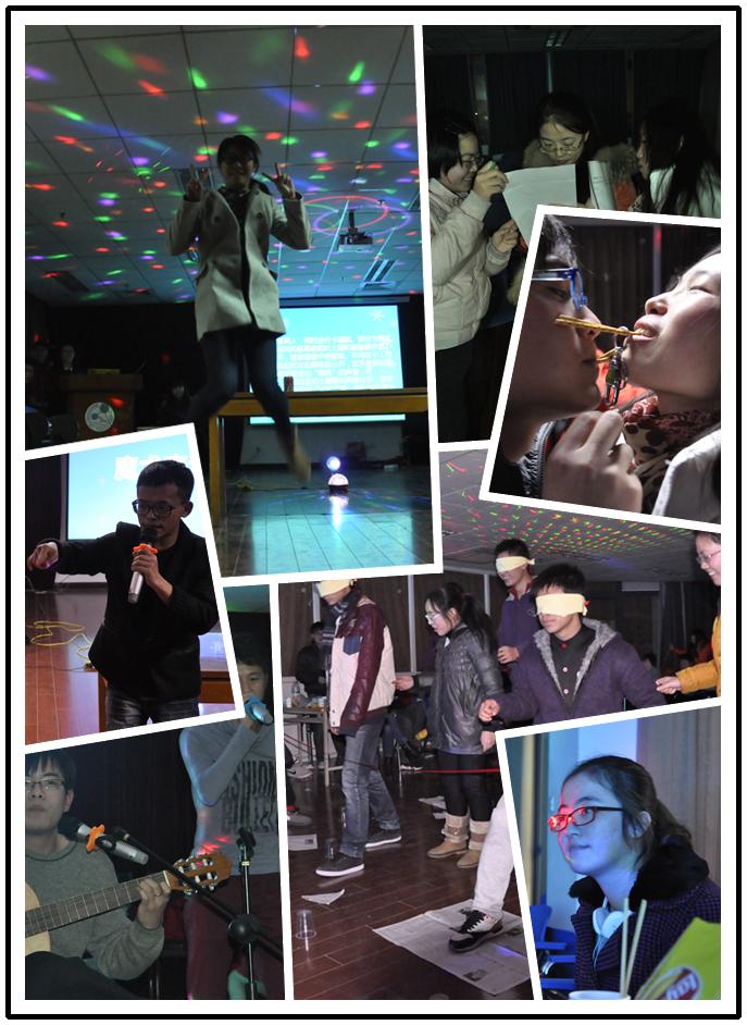 在经过开场前的签到和简单的活动介绍之后,各式表演和游戏陆续登场。首先是一段充满青春活力的街舞表演,紧接的是让参与者害羞,观众捧腹的有关于"家乡话"的浪漫告白,邓老师和几位班导师也深情地用家乡话朗读了那段告白。同学们有的听得云里雾里有的掩嘴浅笑有的直呼"好",现场好不欢快热闹。而接下来的"求签名"游戏则把晚会的氛围推向了当晚的第一个高潮。不管是老师还是学生,认识的或不认识的,人手一纸一笔,在别人的纸头上签上大名的同时也求来了对方的签名。游戏结束后,纸片上名字最多者近50人,该同学获得了优盘作为奖励,而我们可爱的陆晨学姐因为找她求签名的人太多而无暇找他人要签名,只得接受了惩罚。