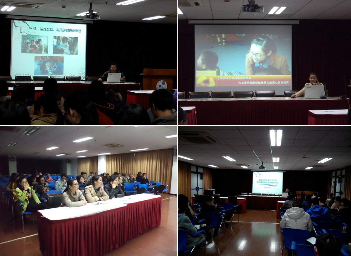首先由生命学院研究会主席李阳对于11月23日开展的第一次赴上海明珠医院志愿服务活动做了一个简单介绍。他介绍到,去医院帮助脑瘫儿童,在接触脑瘫儿童之前,医院会有一个相关知识专业的培训,主要包括脑瘫儿童的一些基本情况以及帮助他们做复建的动作等相关知识。在游戏互动时,志愿者们与孩子们彼此熟悉,孩子们脸上灿烂的笑容表达了对志愿者们的欢迎和喜爱。当介绍到,安徽一个家庭四胞胎都不幸的遭遇这种疾病时,在场的同学们都表示惋惜和同情。在志愿者们离开时,与一些孩子家长互留了联系方式,以方便后续的帮助。