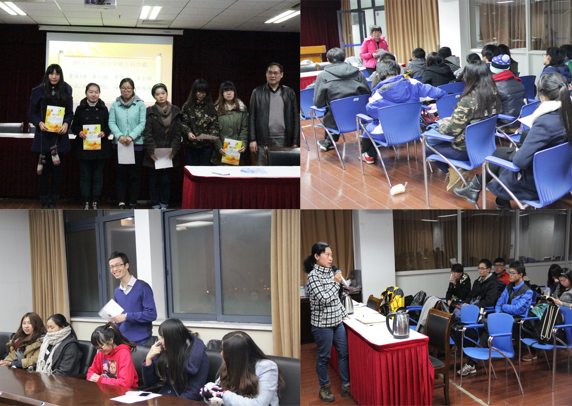 本次班会主要分为两部分,第一部分是各班新晋学习委员汇报和分析班级的学习情况以及对进步同学的颁奖表彰,第二部分是由各班班导师准备的职业规划主题分享。汇报部分,食品1班学习委员赵喆超、食品2班学习委员张亮、生工1班学习委员林碧宇和生工2班学习委员陈丰在班会前都经过了学习情况数据整理和分析的相关培训,辅导员帮助他们尽快掌握整体情况和个别情况,同时训练他们对自己班级做出具体的分析并思考大三一年的学习对策,以此为内容进行了班级学习情况的展示。之后由邓老师为学习进步同学进行颁奖。在秋季学期的学习中,食品1班刘洋、生工1班张博凝获得"生科给力股",绩点进步1.0以上,生工2班毛东升、张晓丽、李俊阁、食品1班赵喆超、食品2班季节、王建树、和樊嘉连获得"生科潜力股",绩点进步0.5以上。而且在大二一年的学习中,也涌现了一批积极进取的学生,生工1班朱慧、生工2班伏署光、陈丰和陈秀颖、食品2班张美琦进步最大,因此授予"年度生科给力股"称号,而生工1班刘杰、生工2班崔收庆、食品1班崔一迪、食品2班张亮、罗力文、邹施琪和邝平进步明显,因此授予"年度生科潜力股"称号。大三开始,同学们的学习状态日趋稳定,进步空间有所减小,因此为了鼓励学生突破自我,特别设立"生科学霸"为每学期考入班级前三的同学正名,此次秋季学期中获得"学霸"称号的是生工1班王赟婕、韩立和林碧宇;生工2班王亚龙、吴启文和陈秀颖;食品1班崔一迪、李梦云和石小丽;以及食品2班李诗怡、潘君青和邹施琪。虽然名次是很次要的,但积极营造"比、学、赶、超"的学风是值得提倡的。