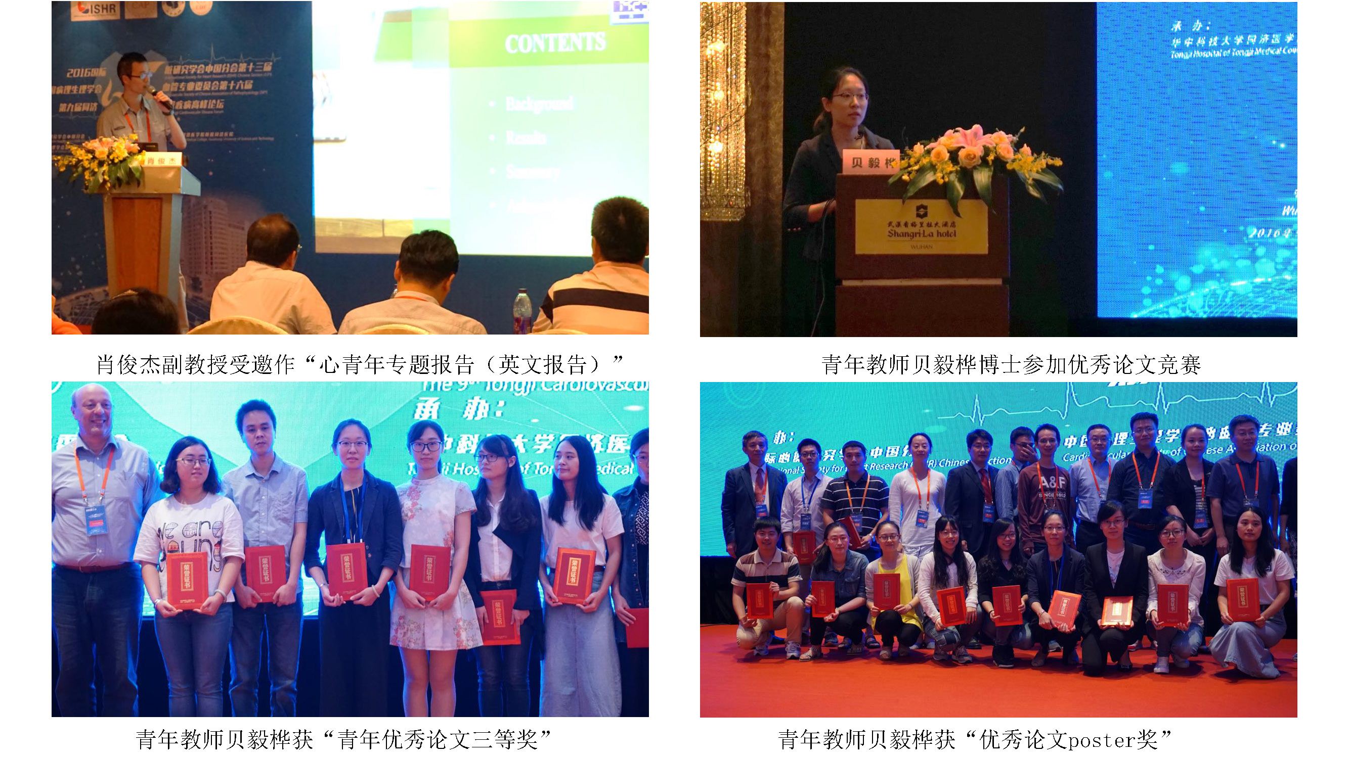 在此次会议上,肖俊杰副教授受邀作"心青年专题报告(英语报告)"。肖俊杰副教授向与会者详细地介绍了课题组与南京医科大学、哈佛大学等合作完成的关于微小RNA-433介导心脏纤维化的研究工作,该研究发现心脏纤维化增加微小RNA-433的表达,而微小RNA-433可以通过降低AZIN1、激活TGF-beta1、磷酸化Smad3,促进心脏纤维化的发生。此外,微小RNA-433也可以降低JNK1、磷酸化ERK和P38,从而促进心脏纤维化的发生。该研究已于近期发表在Theranostics杂志(Theranostics 2016; 6(12): 2068-2083. doi:10.7150/thno.15007),该杂志的影响因子为8.854。此外,我院青年教师贝毅桦博士获得"卢杨基金"青年优秀论文"三等奖"和"优秀论文Poster奖"。
