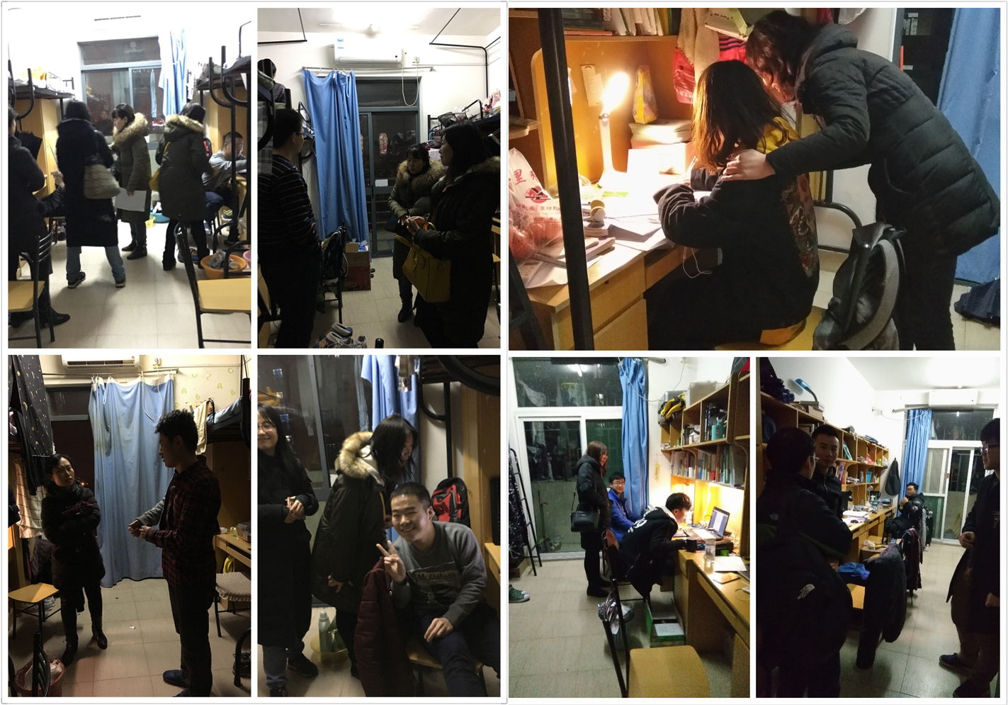 四位老师先后来到南5男生宿舍和南14的女生宿舍,走访每一间寝室,询问同学们复习情况,提醒同学们考试周临近,好好进入备考状态,并对这学期所开设课程的复习方案提出了针对性的指导。同学们总体的学习状态良好,大部分同学都能在寝室做到自觉复习,准备作业PPT。当然也有部分同学在打游戏,老师们对其进行严肃的提醒。在关心同学们学习的同时,四位老师不忘提醒大家注意身体,吃好饭,休息好,劳逸结合。