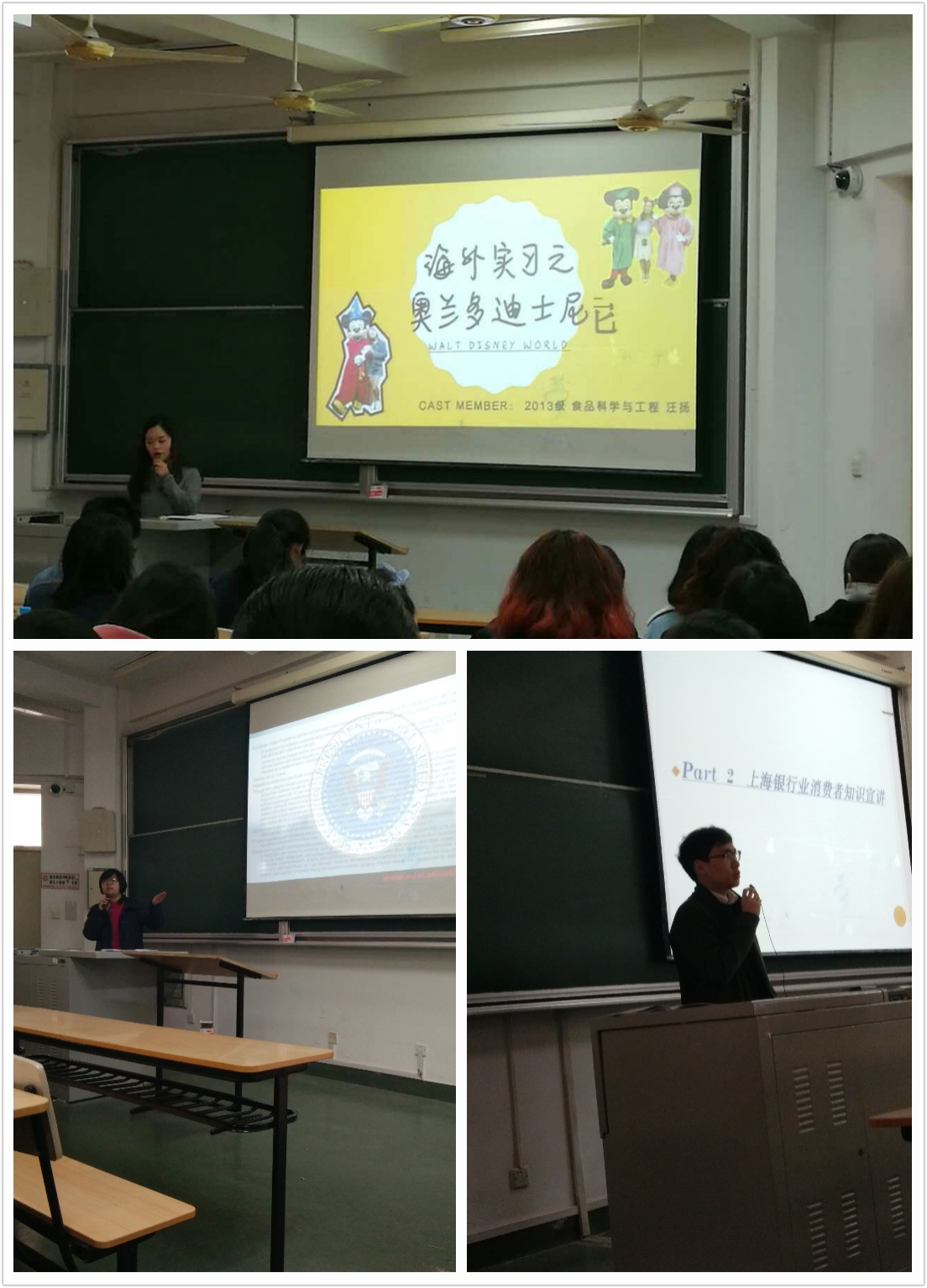 首先,365英国上市公司中外服-美邦国际赴美带薪实习项目负责老师分别给14级、15级同学进行了项目的介绍。宣讲老师通过一个有趣而丰富的短片带领同学们了解美国、认识美国。同时,介绍了该项目实习岗位申请方式等等。其次,由大四的汪洋同学以自己的亲身经历风趣而幽默的为15级同学介绍迪士尼海外实习项目,汪杨针对学院的课程设置特色,给同学在选课方面实质性的建议,以便同学们在不影响课程的情况下参与该项目。另外,学院邀请了招商银行的工作人员,同时也是学院12级的毕业生李维诚同学,进行了上海银行消费者知识宣讲。他通过真实的案例严肃的告诉大家电信诈骗的严重性,也讲解了当信用卡丢失时的措施以及身份证的重要性。告诫同学们增加提防意识,谨防上当。随后,海棠老师以及何凤霞学姐向同学们介绍了嘉定"生物人"培训实习基地的项目,鼓励大家积极参与。