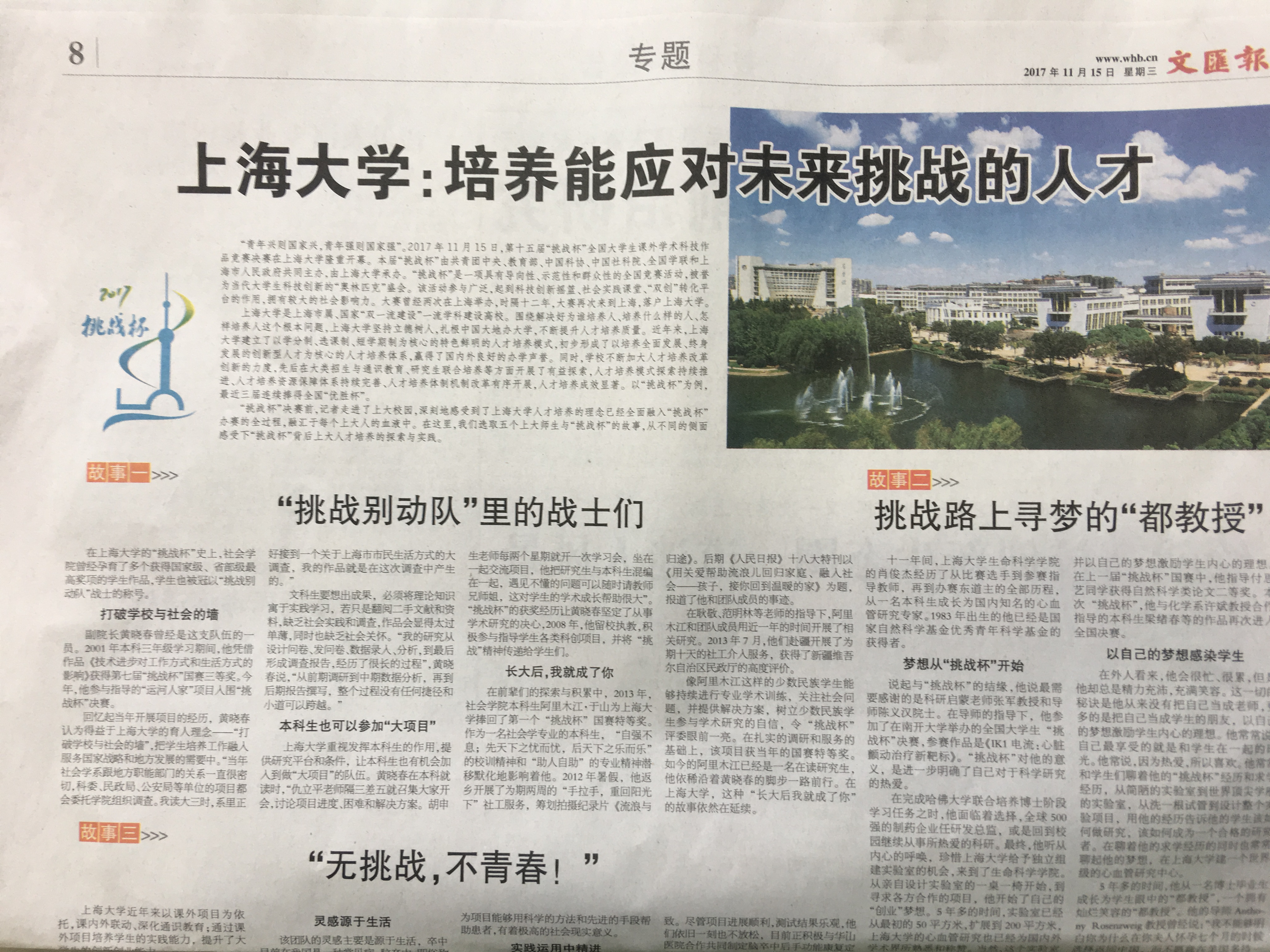 在2017年11月15日出版的《文汇报》第8版面中,刊登了《上大海大学:培养能应对未来挑战的人》的专题报道。其中,我院肖俊杰副教授以故事主人公出现在了报道中。十一年间,肖老师从参加"挑战杯"竞赛的学生变成了指导学生参加"挑战杯"的老师,如今365英国上市公司承办第十五届"挑战杯",他又以办赛东道主的身份参与,并继续指导学生参赛,最终为我院赢得第一个理工科作品全国特等奖,也是365英国上市公司第一个自然科学学术论文全国特等奖。