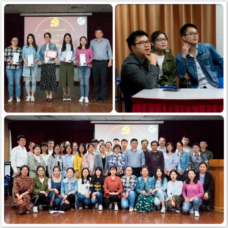 竞赛开始之前,邓志瑞老师带领大家学习习近平总书记在北京大学师生座谈会上和纪念马克思诞辰200周年大会讲话精神。随后,进入紧张的比赛环节,参与竞赛的师生分别来自5个教师党支部和3个学生党支部,师生搭配组成五支队伍。比赛分为小组必答题、抢答题,个人必答题、抢答题两大环节,比赛现场气氛紧张,异常激烈,扣人心弦。比赛中,选手们都精神饱满,认真作答,均以接近满分的成绩通过了第一环节的考验。接下来是个人代表出战,她们沉着冷静,从容应对,紧接的是激动人心的抢答题,不同于小组抢答,各代表需抢中心的话筒答题,她们个个眼疾手快,在主持人的一声令下迅速奔向话筒并立即说出答案。在场上胜负难分的时刻,邓志瑞老师提出一个建议,让每队的老师说出自己的入党日期,如果正确则加分,他强调,要永远铭记成为党员的那一刻,不忘初心,牢记使命。经过激烈的角逐,神经生物学支部力压群雄获得了第一名。比赛结束后,在场的老师们为获奖选手颁发了奖状和奖品,并与选手们合影留念。