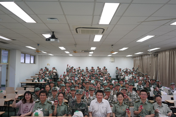 7月18日,为期十天的军训已经过去6天了,军训进度条已经过半。午休前,男生141连及女生134连的全体生命学院的同学们汇聚在FJ104教室,这是军训以来第一次学院参训同学们的大聚会,而教室里有一份惊喜正等待着大家——来自学院的慰问。教室的课桌上整齐摆放着一个个零食礼包,学院送来的慰问礼包一瞬间驱赶酷热与训练带来的疲乏感,同学们精神振奋。不一会儿,学院党委书记沈忠明、党委副书记朱晓青、团委书记陆晨走进教室,来慰问参训师生。