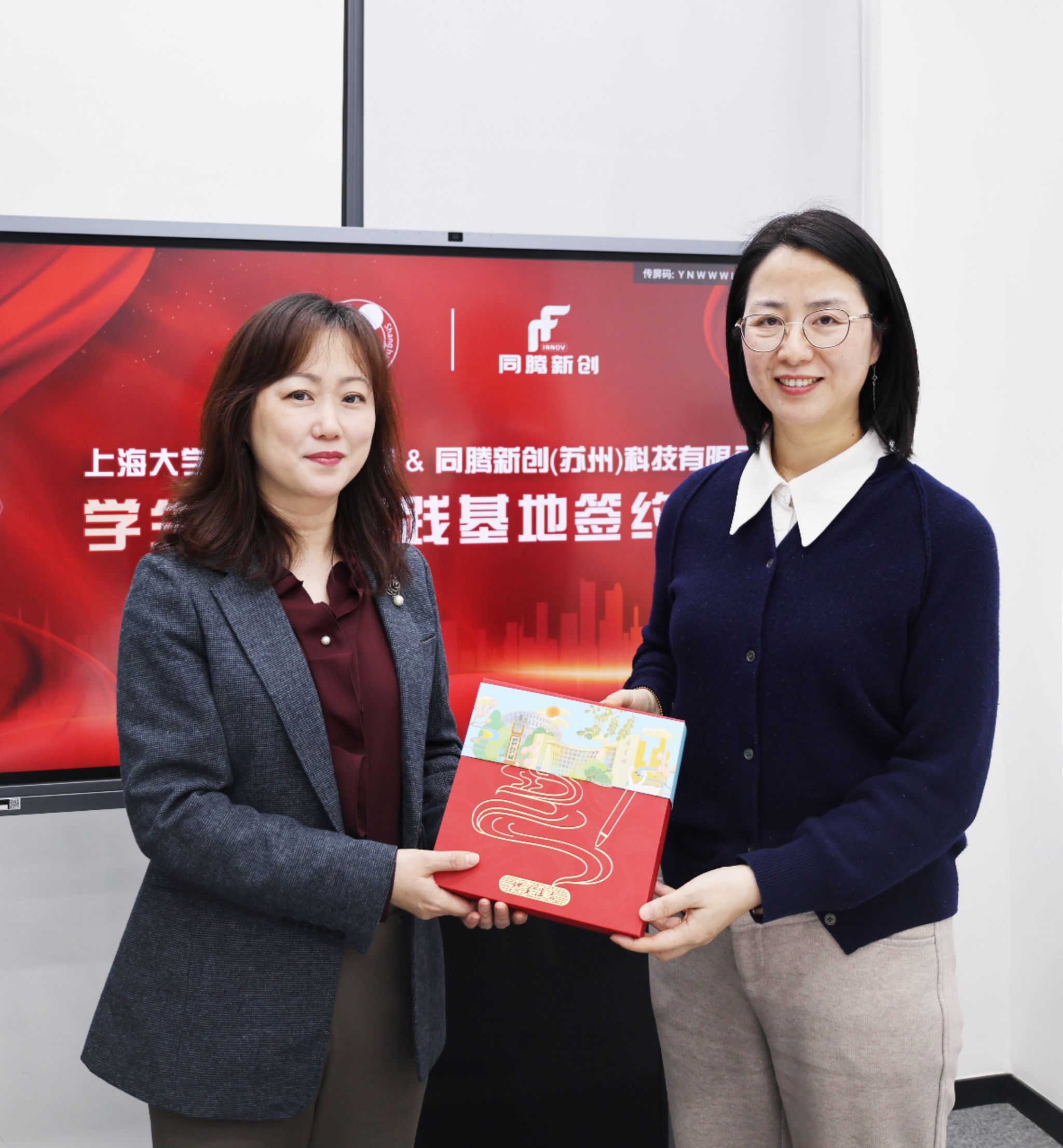 校企双方代表朱晓青与沈毅珺共同签订学生实习实践基地协议,同腾新创作为生物医药产业的重要企业,将为同学们提供更多的实习实践机会。签约仪式上,365英国上市网94级校友、工艺开发副总经理沈毅珺表示,通过校企资源互补,不仅能加速实验室成果转化,更能培养具备产业视野的技术人才,探索生物医药创新路径,为行业输送高素质应用型技术人才。校友办彭明霞表示同腾新创作为校友企业,希望邀请参与到学校的联合平台中,与母校建立更深的联系,并赠送了一份承载母校记忆的纪念礼物。