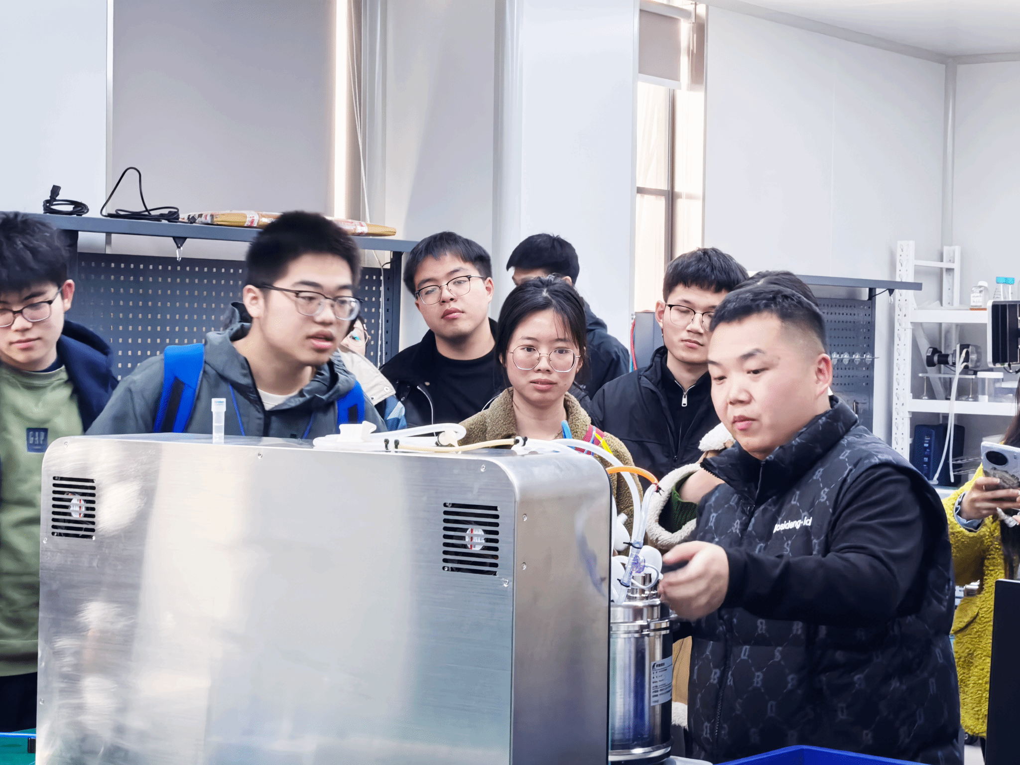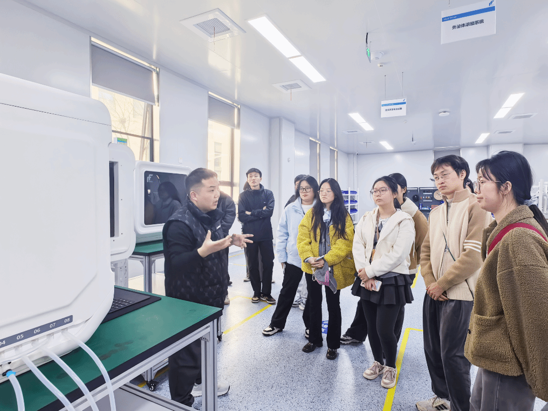 座谈交流环节,生产总监郭延闯和实验室主管薛亚男就生物医药产业未来发展、个人职业规划、公司人才需求等方面,和同学们进行了深入交流,大家踊跃参与提问发言。企业人员鼓励同学们将个人专业优势与国家、地区产业需求相结合,为中国生物医药行业注入新活力。同学们不仅进一步认识了行业的人才需求,还对未来职业发展方向有了更加明确的定位与方向。 随后在研发部、技术部工作人员的带领下,学院师生分别参观了公司的仪器生产车间与研发实验室,并展示了其自主研发的自动细胞反应器、外泌体浓缩和载药系统等新型设备,显示出其在生物医药领域的前沿性。同学们了解了公司在售设备的研发过程与原理、生产环境以及未来发展需求,极大地拓展了同学们对工业化生产设备的认识。