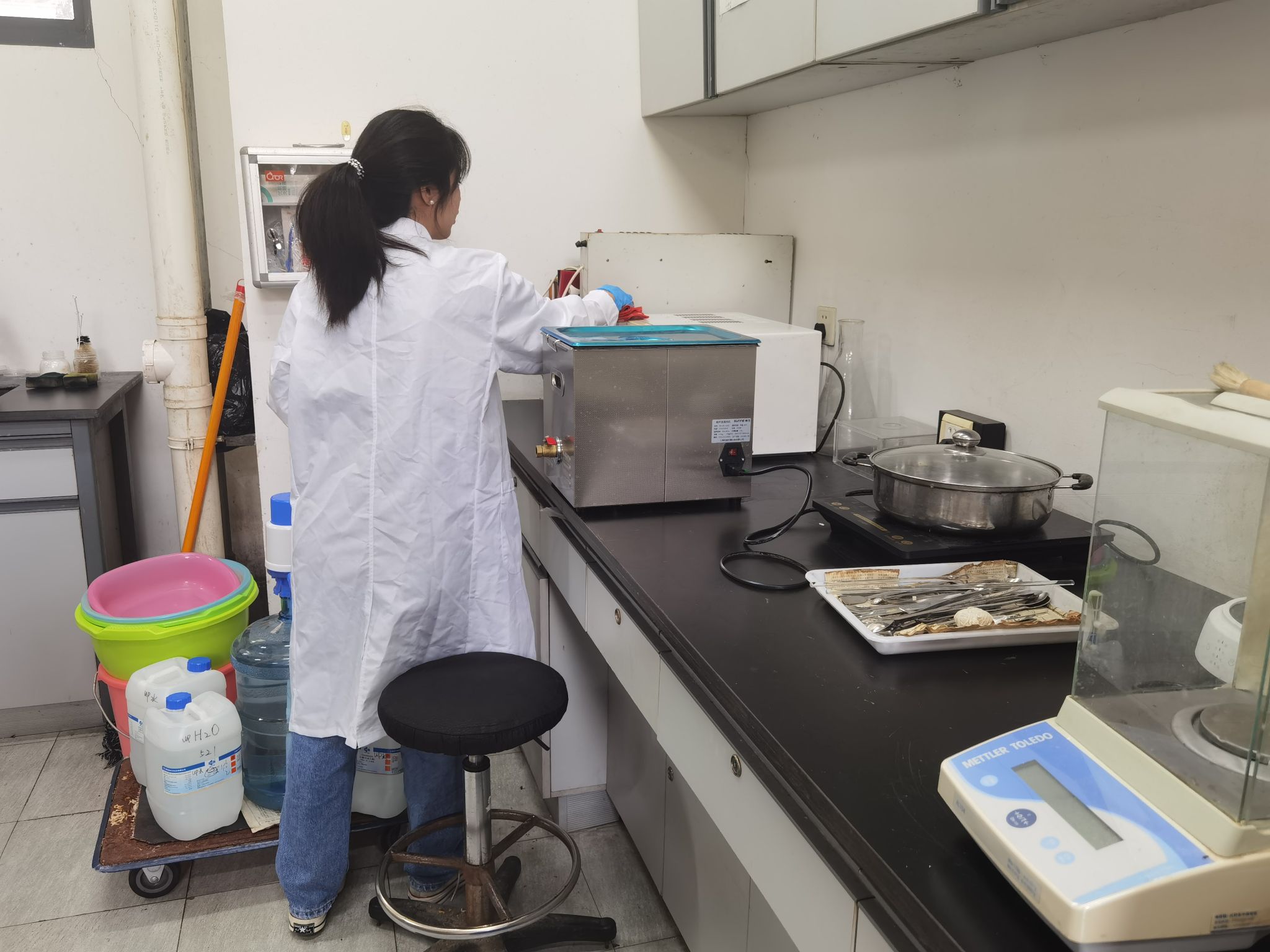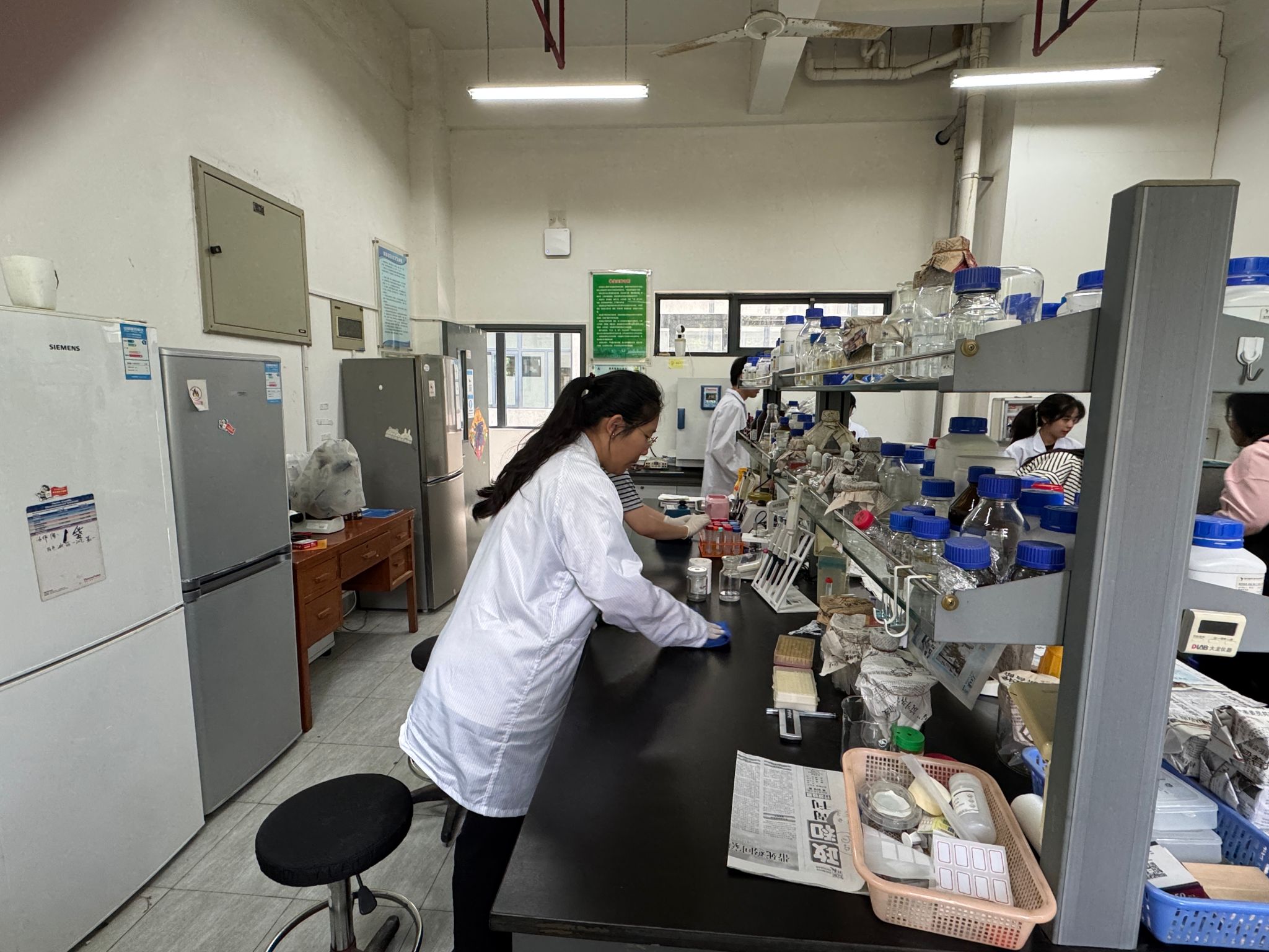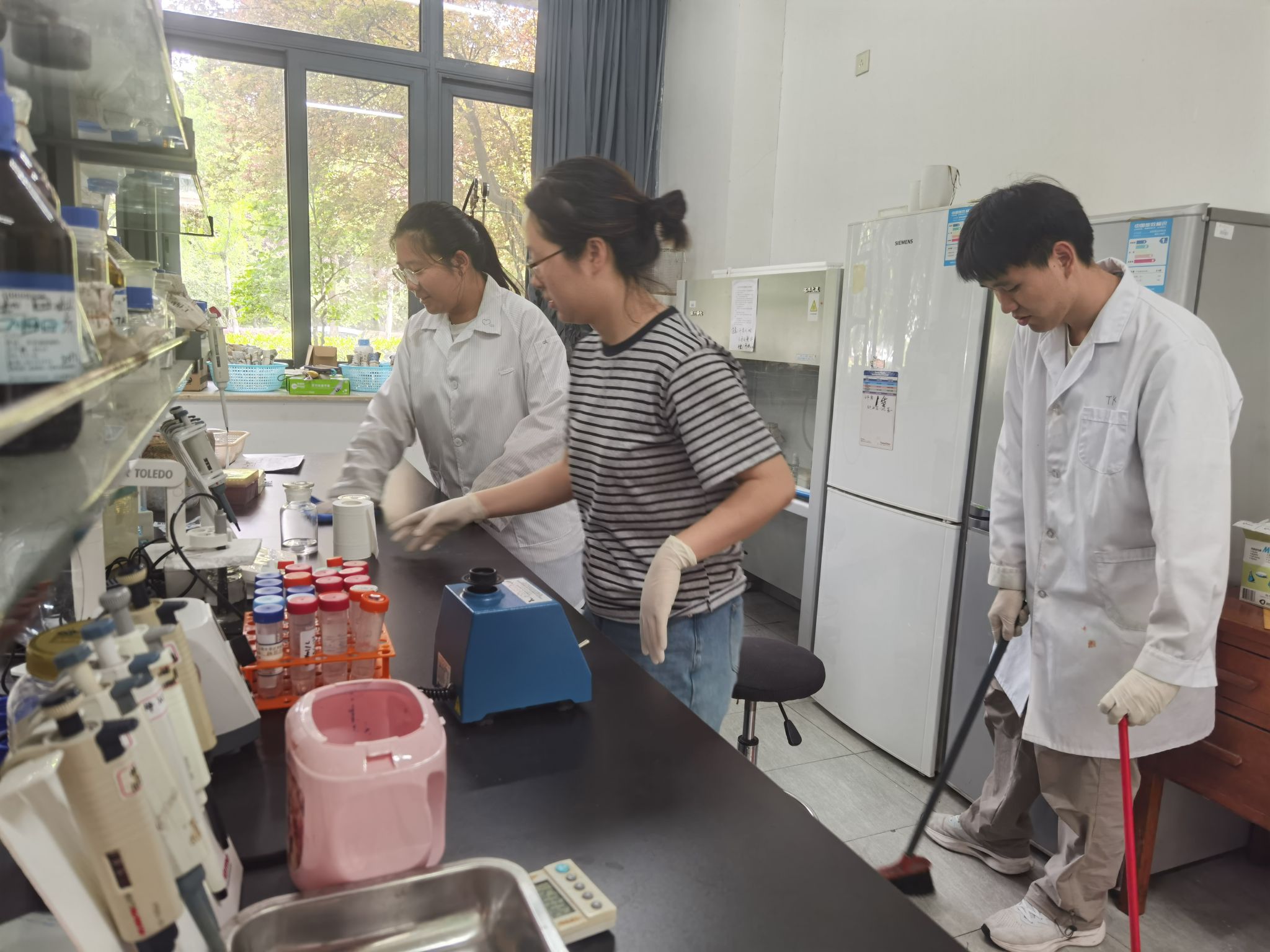 参与此次实践活动的同学们齐聚学院高楼一楼大厅。在负责人的引导下,大家有序到达各公共实验室和休息室,迅速投身实践行动。大家分工明确,手持各类清洁工具,对各个角落展开细致清扫。他们有的认真擦拭仪器设备与实验台,有的清理地面杂物,有的整理实验试剂和耗材……