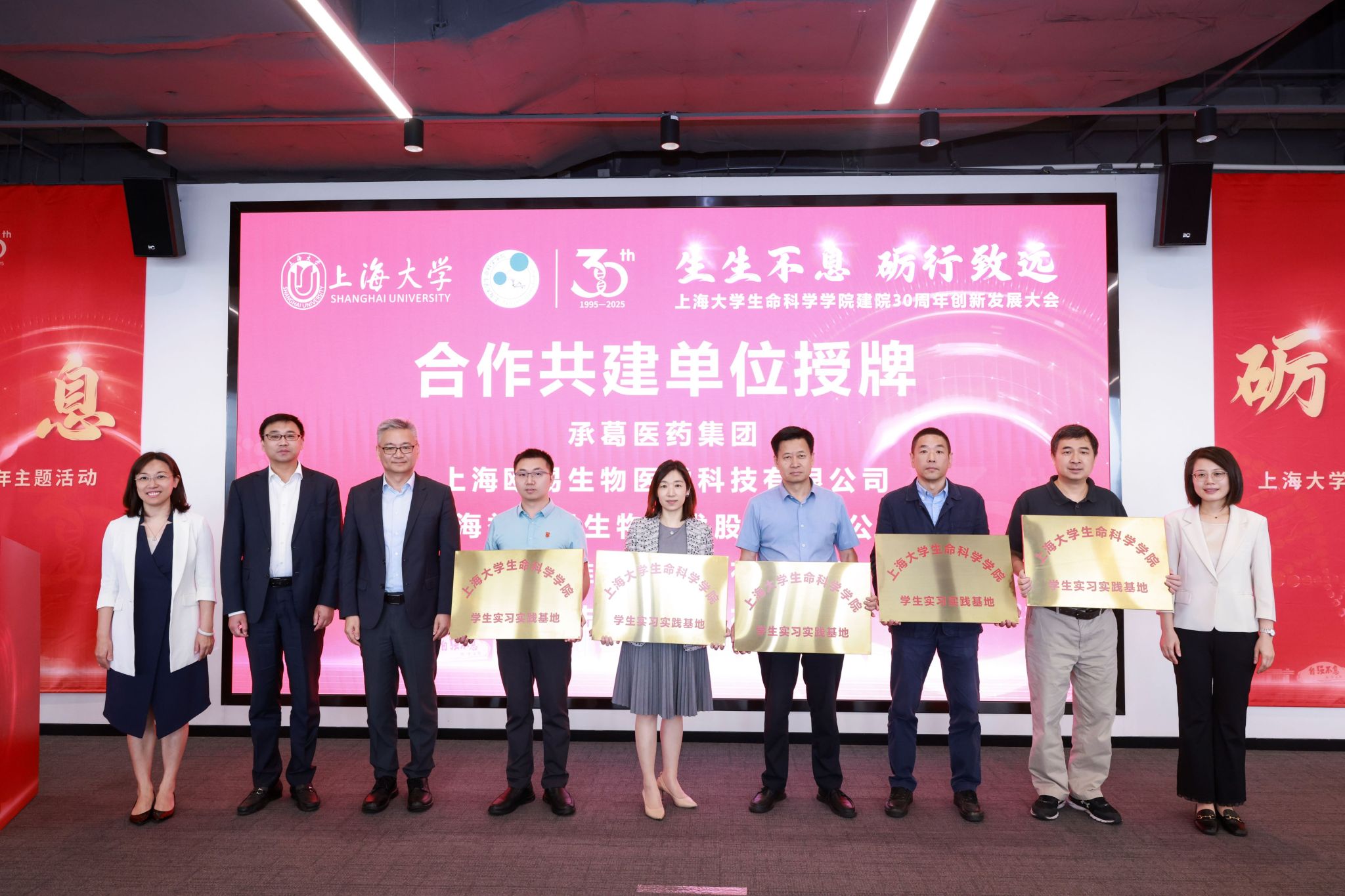 此外,会上还举行了校企合作共建授牌仪式,承葛医药集团、上海欧易生物医学科技有限公司、上海兆维科技发展有限公司(1994届校友创办)、上海益诺思生物技术股份有限公司、上海赛陆生命科学有限公司等5家企业成为学院签约合作共建单位,标志着学院在深化产教融合、汇聚校友资源方面取得新突破。此次合作以人才培养与产业需求精准对接为导向,今后将进一步加强高校与企业的产学研合作,促进科技成果转化,推进“产教融合、协同育人”真正落地。