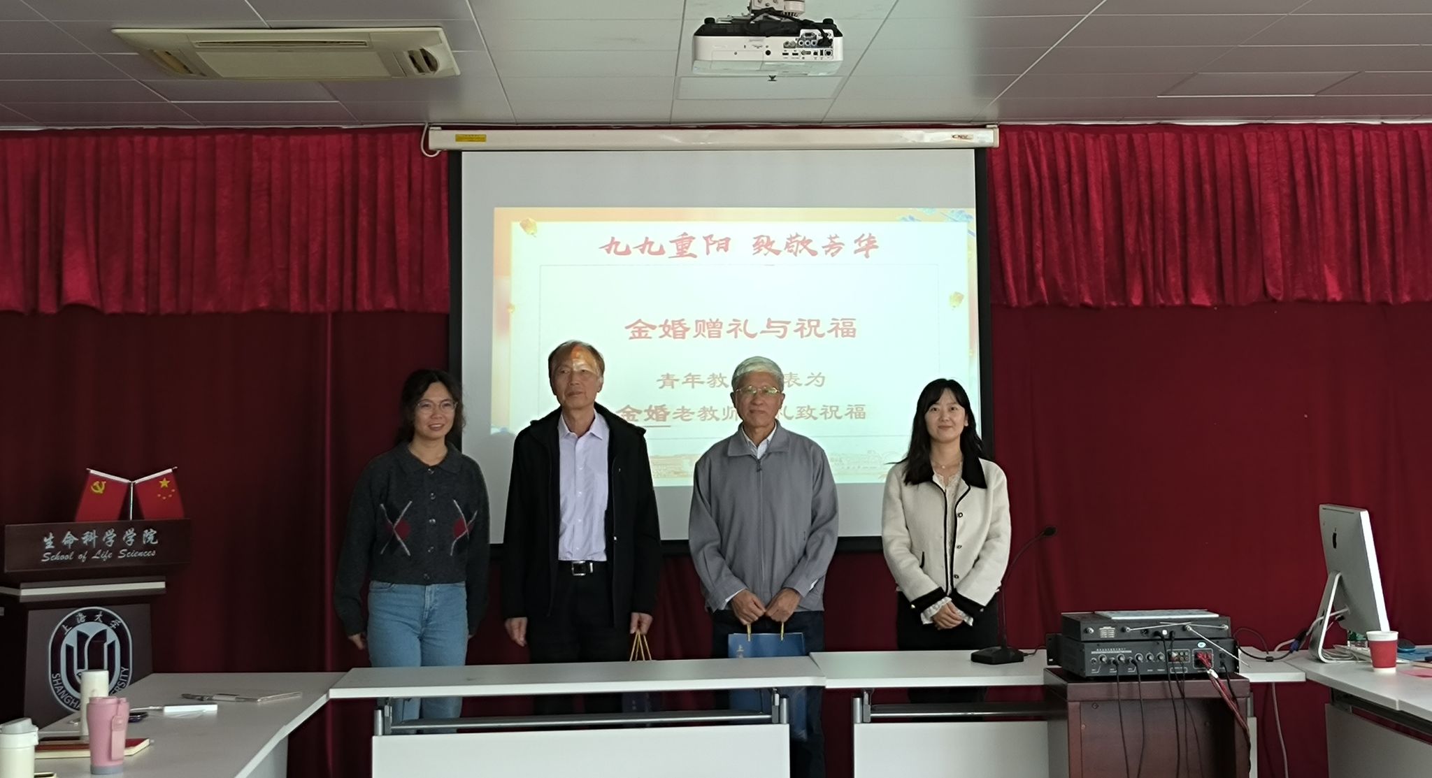 在“金婚”庆祝环节,两位新婚青年教师代表为两对金婚老教师送上精心准备的祝福礼品,向他们数十年相濡以沫、互敬互爱的真挚情感致以崇高敬意。两对金婚老教师也分享了各自的相处心得与人生感悟,言语间满是温情与智慧,为在场青年教师上了生动的一课。