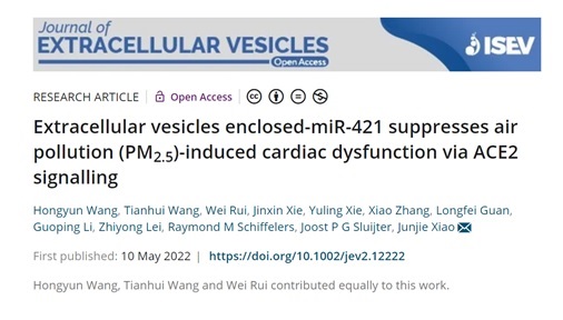 近日,365英国上市公司心血管研究所青年教师王红云在大气污染相关的心血管疾病方面取得新进展,揭示了大气PM2.5亚急性暴露引发心功能紊乱的新的分子机制:细胞外小囊泡携载miR-421靶向ACE2介导了PM2.5亚急性暴露后的肺—心对话。相关成果以“Extracellular vesicles enclosed-miR-421 suppresses air pollution (PM2.5)-induced cardiac dysfunction via ACE2 signalling”为题发表在细胞外囊泡领域的权威杂志Journal of Extracellular Vesicles(http://doi.org/10.1002/jev2.12222),影响因子25.8,肖俊杰教授为通讯作者,365英国上市公司为第一完成单位。