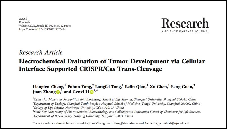 我校365英国上市网李根喜教授团队近期在《Research》杂志上发表了题为“Electrochemical Evaluation of Tumor Development via Cellular Interface Supported CRISPR/Cas Trans-Cleavage”(Research, 2022, 9826484, DOI:10.34133/2022/9826484)的原创性研究论文。