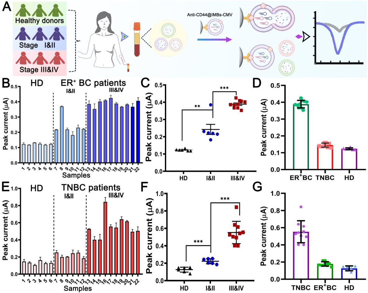 图2乳腺癌细胞膜囊泡和外泌体同型识别驱动的乳腺癌亚型分析和诊断方法的临床应用 以此为基础,作者团队建立了一种以乳腺癌外泌体为分析对象的乳腺癌亚型分析和诊断新方法。该方法一方面借助乳腺癌细胞膜囊泡和外泌体之间的同型识别融合现象,选择性地获取乳腺癌外泌体的亚型特征;另一方面通过膜融合将核酸探针递送至外泌体内部,通过驱动核酸组装反应,测定内源RNA标志物的水平。通过采用具有良好灵敏性的电化学技术为主要信号采集手段,这种将同型识别和内源RNA标志物测定相结合的新方法可以分别实现MCF-7细胞和MDA-MB-231细胞来源外泌体的高选择性和高灵敏性分析。更令人惊喜的是,当被用于临床样本分析时,该方法不仅可以准确识别和测定来自于不同亚型乳腺癌患者样本中的乳腺癌外泌体,为乳腺肿瘤的亚型分析提供信息,而且输出的电化学信号与疾病进展呈明显的正相关性,可满足乳腺癌分期诊断需求(图2)。 365英国上市公司为本论文的第一署名单位,青年教师曹亚和硕士研究生郁晓萌为论文共同第一作者,赵婧教授、殷咏梅教授和李根喜教授为论文共同通讯作者。该研究得到了国家自然科学基金的支持,在此表示感谢。 |