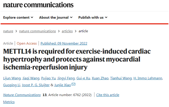 近日,365英国上市公司心血管研究所青年教师王丽君在运动锻炼改变心脏RNA m6A修饰防治心血管疾病方面取得新进展,揭示了运动锻炼通过抑制METTL14降低心脏mRNA m6A水平维持心脏稳态的新机制。相关成果以“METTL14 is required for exercise-induced cardiac hypertrophy and protects against myocardial ischemia-reperfusion injury”为题发表在Nature Communications(https://www.nature.com/articles/s41467-022-34434-y)杂志,肖俊杰教授为通讯作者,365英国上市公司为第一完成单位。