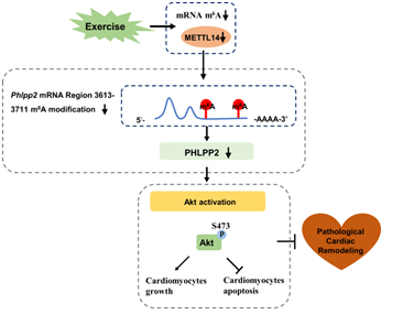 心力衰竭是心血管疾病常见的终末期结局,预后差。心力衰竭发生时往往伴随着心肌细胞的慢性丢失和心肌细胞功能紊乱,因此,促进心肌细胞存活成为防治心力衰竭的关键。运动训练可以诱导生理性心肌肥厚的发生,从运动心脏中挖掘出的关键分子及信号通路具有“一石三鸟”效应,即运动中的关键分子能促进心肌细胞肥大和增殖、增强心肌细胞抵抗凋亡的能力,从而对心脏起到保护作用。尽管在心力衰竭和运动诱导生理性心肌肥厚等干预条件下,转录因子和转录共激活因子等已经被关注和研究,但是可能影响关键蛋白表达和心脏功能的心脏mRNA的转录后调控研究甚少。RNA m6A是哺乳动物细胞中高度保守且分布广泛的修饰,在基因转录后调控中发挥重要作用。在心血管系统中,RNA m6A修饰被发现参与心脏稳态维持和疾病的发生,然而,运动锻炼是否通过调节RNAm6A修饰介导心脏稳态维持及其在生理性心肌肥厚中的作用尚不清楚。该研究发现运动锻炼降低小鼠心脏中mRNA m6A甲基化水平。运动锻炼后,心脏RNA m6A甲基转移酶METTL14在RNA m6A甲基化水平和蛋白质水平均显著性下调;进一步研究METTL14介导的RNA m6A修饰在心肌细胞中的功能和机制研究表明,沉默METTL14会抑制Phlpp2mRNA m6A修饰并激活Akt-S473,进而调节心肌细胞的生长和凋亡。在体内,野生型METTL14过表达可以增加心脏mRNA m6A的甲基化水平并阻断运动诱导生理性心肌肥厚的发生,然而MTase失活突变体METTL14则不具有该功能;心脏特异性抑制METTL14可以减轻急性心肌缺血再灌注损伤以及心肌缺血再灌注重构所致的心功能障碍。该研究明确了METTL14是介导运动锻炼诱导的生理性心肌肥厚的关键RNA m6A甲基转移酶,抑制METTL14在运动锻炼抗心血管疾病中具有关键作用。该研究解析了运动锻炼时心脏中RNA m6A的图谱变化,为深入理解运动锻炼保护心血管健康的理论知识和开发运动锻炼替代性药物治疗心血管疾病奠定了基础。