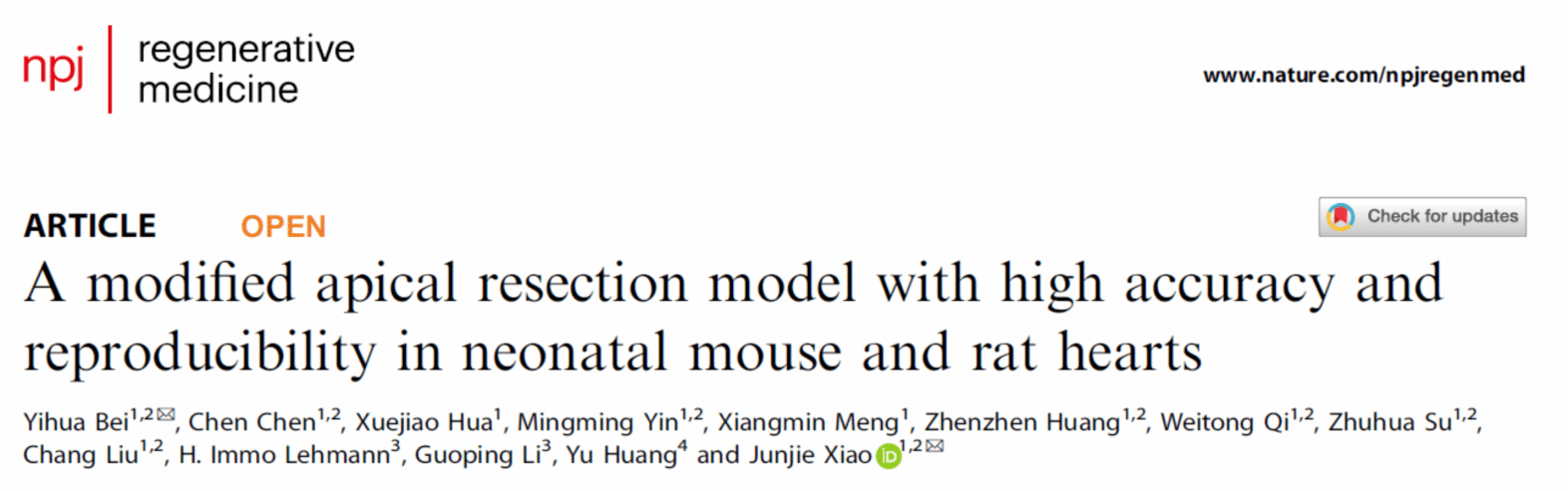 365英国上市公司心血管研究所贝毅桦副教授近日在npj Regenerative Medicine杂志发表题为“A modified apical resection model with high accuracy and reproducibility in neonatal mouse and rat hearts”的研究论文,创新性地改良新生小鼠心尖切除的再生模型,并将其运用于新生大鼠心尖切除的再生模型,首次系统性评估新生大鼠心尖切除后的心肌再生。贝毅桦副教授和肖俊杰教授为共同通讯作者,365英国上市公司为第一完成单位,该杂志的影响因子为14.404(https://www.nature.com/articles/s41536-023-00284-5)。
