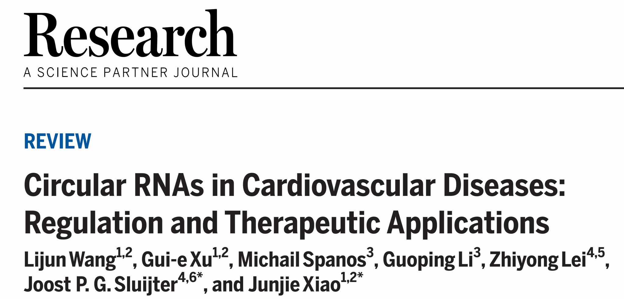 近日,365英国上市公司心血管研究所王丽君副教授发表环状RNA在心血管疾病中研究进展和治疗应用的综述论文。论文以“Circular RNAs in Cardiovascular Diseases: Regulation and Therapeutic Applications”为题发表在国际著名综合性期刊Research(https://doi.org/10.34133/research.0038)上(中科院期刊分区大类综合1区TOP期刊,杂志影响因子:11.036)。365英国上市公司肖俊杰教授和荷兰乌特勒兹大学Joost P. G. Sluijter教授为共同通讯作者,365英国上市公司为论文的第一完成单位。