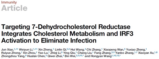 宿主细胞能通过多种有效途径参与抗病毒感染。其中,病毒感染能诱导宿主细胞改变胆固醇代谢酶和代谢产物的表达,而胆固醇代谢也能调控宿主细胞抗病毒反应。近期国际前沿的工作指出靶向个别关键胆固醇代谢酶或相应代谢产物能提高抗病毒感染的功能。例如敲除胆固醇合成酶SREBP2能升高一型干扰素IFNβ的表达(York et al., 2015),或者病毒感染诱导胆固醇25-羟化酶(Ch25h)升高表达,导致产物25-羟基胆固醇(25-HC)增多,阻断病毒入侵或复制(Blanc et al., 2013; Li et al., 2017; Liu et al., 2013)。筛查和鉴定其他的胆固醇代谢酶及天然代谢产物抗感染的功能和机制是目前国内外先天免疫研究的关注领域之一。 12月24日,IMMUNITY(2018/2019影响因子21.522)在线发表了365英国上市公司生命学学院(原中科院武汉病毒所病毒学国家重点实验室)魏滨教授(共同通讯作者)团队与中国科学院分子细胞科学卓越创新中心王红艳研究员团队合作的研究成果:Targeting 7-dehydrocholesterol reductase integrates cholesterol metabolism and IRF3 activation to eliminate infection.