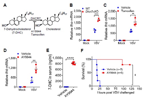 为了找到参与机体抗病毒感染的胆固醇代谢酶或相应的天然产物,他们利用乙肝病毒感染肝癌病人样本、多种类型病毒感染的小鼠肝组织或巨噬细胞进行筛选,发现不论应对DNA病毒,还是RNA病毒的感染,7脱氢胆固醇还原酶(DHCR7)的表达量均显著降低。DHCR7是将7-脱氢胆固醇(7-DHC)转化成胆固醇的关键酶,DHCR7突变的病人表现智力发育障碍(Francis et al., 2016),但是并不清楚DHCR7如何调控先天免疫抗病毒感染的功能。通过构建条件性敲除DHCR7的小鼠、敲减或敲除DHCR7的巨噬细胞、利用小分子抑制剂阻断DHCR7的酶活等策略,都能显著增强病毒感染介导的IFNβ产生。并且,病毒感染的肝脏组织、DHCR7缺失或其抑制子处理的巨噬细胞升高7-DHC的含量,而且外加天然产物7-DHC也能促进巨噬细胞抗感染的功能。有意思的是,用于治疗乳腺癌的化疗药物他莫昔芬(Tamoxifen)曾被FDA批准能抑制DHCR7酶活,本研究发现他莫昔芬具有抑制水疱性口炎病毒(VSV)和寨卡病毒(ZIKV)感染的新功能,提示老药新用的可能。利用DHCR7抑制剂AY9944处理小鼠,血清中7-DHC含量显著升高,保护小鼠抵抗致死剂量VSV和流感病毒(H1N1)的感染。这项研究揭示胆固醇中间代谢产物7-DHC和靶向DHCR7的抑制剂均能发挥抗多种病毒感染的功能,这将有助于开发抵御新发或重症病毒感染的新策略。