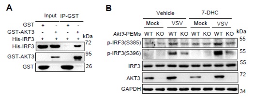 更进一步的机制探索发现:静息期的巨噬细胞表达很低水平的AKT3,病毒感染促进AKT3的表达,而代谢产物7-DHC能促进PI3K-AKT3的活化。此外,作为蛋白激酶的AKT3直接结合IRF3,增强IRF3在丝氨酸385位的磷酸化,进而促进IRF3二聚体形成和向细胞核内转移,最终增强IFNβ产生。敲除AKT3的小鼠显著降低IFNβ的产生,升高病毒载量,导致更多小鼠死亡。