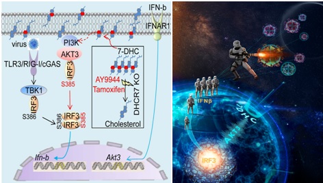 左图:研究的模型示意图;右图:卡通科普图《当外星体入侵地球时,地球表层的预警中心(7-DHC)发射急救信号(AKT3)到达地心指挥部(IRF3),使得地球卫士(IFNβ)大量并迅速集合,运输到宇宙中抵抗外星体。》