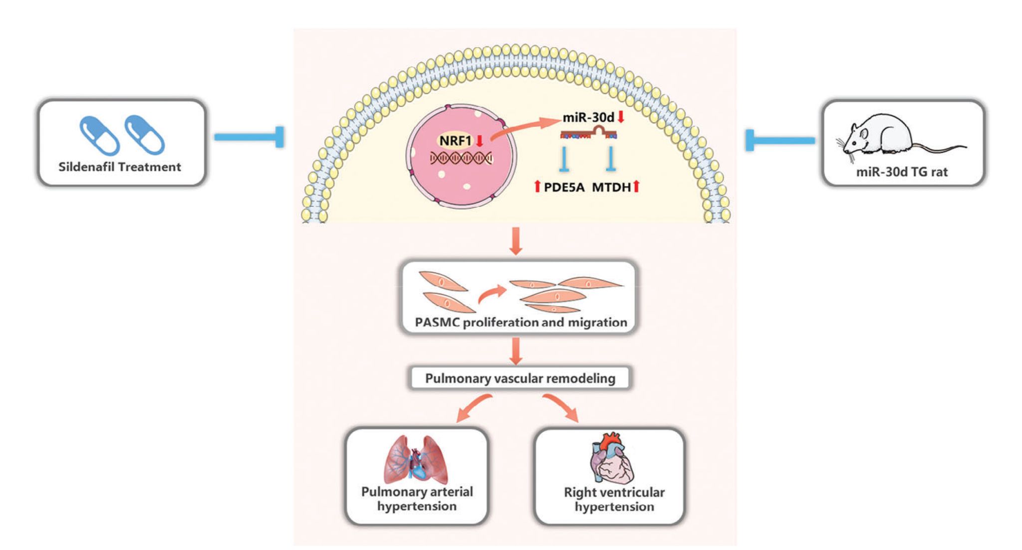图:miR-30d下调介导肺动脉高压和肺血管重构,而过表达miR-30d是肺动脉高压的有效治疗途径,miR-30d介导西地那非在肺动脉高压中的治疗效应。 |