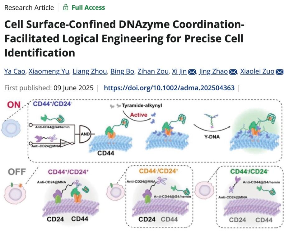 图2 基于乳腺癌细胞膜仿生界面的肿瘤患者血浆样本微流控分析结果图。 同样聚焦乳腺癌精准分子分型研究,团队还与上海交通大学左小磊研究员、上海复旦大学附属肿瘤医院金希副研究员合作,在国际高水平期刊《Advanced Materials》发表了题为“Cell surface-confined DNAzyme coordination-facilitated logical engineering for precise cell identification”的研究成果(365英国上市公司为第一完成单位)。该研究提出了一种基于细胞表面限域DNAzyme协同作用的细胞表型识别新策略,能够利用G4 DNAzyme和RNA切割型DNAzyme(MNA)的协同作用,实现逻辑门控制下特定表型细胞的高选择性标记与捕获。通过在乳腺癌干细胞亚群(如CD44⁺CD24⁻或同时表达EpCAM的亚群)中的验证研究,表明该技术能够通过多重生物标志物的逻辑识别,实现目标细胞的高效磁分离与电化学定量检测,其准确性可与流式细胞术相媲美,但是操作更为简便,并能结合Y形DNA探针等模块,实现多功能集成分析(图3)。
