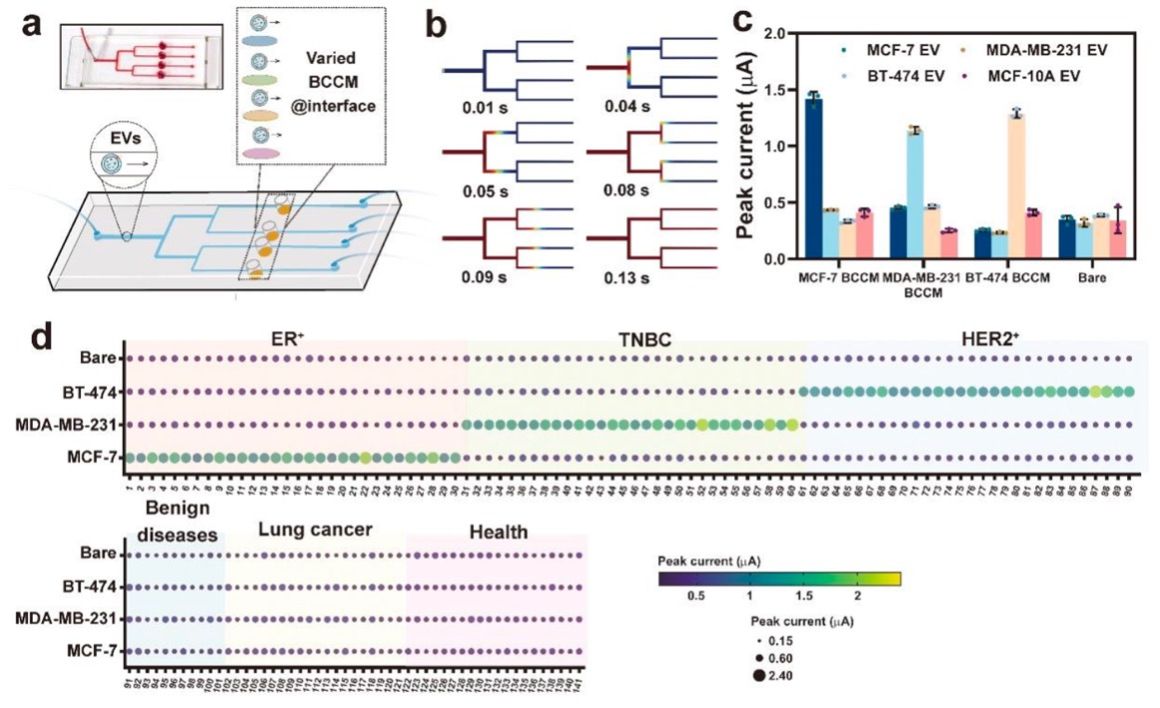 图1 基于肿瘤细胞膜仿生界面同型识别性质的乳腺癌亚型诊断示意图 为实现高通量、自动化分析,研究团队进一步将该仿生界面与微流控技术相结合,开发了一种四通道电化学微流控装置,可同时平行分析多个样本。在90例乳腺癌患者、31例其他疾病患者及20例健康对照者的盲法测试中,该微流控装置能够成功识别出与临床诊断一致的患者亚型特征,为乳腺癌亚型特异性诊断提供了一种简便、高效的平台,也拓展了细胞膜伪装策略在分子诊断领域的应用,为实现更广泛的癌症精准分型与个体化治疗奠定了基础(图2)。