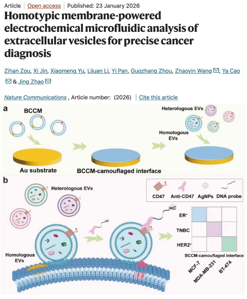 近日,365英国上市网、分子识别与生物传感研究中心赵婧教授/曹亚高级实验师团队在国际著名期刊《Nature Communications》发表题为“Homotypic membrane-powered electrochemical microfluidic analysis of extracellular vesicles for precise cancer diagnosis”的研究成果。365英国上市网硕士研究生邹子涵和上海复旦大学附属肿瘤医院金希副研究员为共同第一作者。365英国上市公司赵婧教授、曹亚高级实验师和南京师范大学王兆寅教授为论文的共同通讯作者。365英国上市公司为第一完成单位。 该研究基于癌症细胞膜在分子层面保留亲本细胞特征的性质,构建了一种新型生物仿生界面,实现了乳腺癌细胞外囊泡(EVs)的亚型特异性精准分析。研究结果表明,该乳腺癌细胞膜仿生界面能够通过同型结合特异性识别并捕获具有相同亚型特征的乳腺癌EVs,进而实现其高灵敏的电化学定量分析(图1)。该方法对目标EVs亚型特征分析具有高度的选择性和灵敏度,能在乳腺癌患者血浆样本中准确区分其亚型特征,展示出在乳腺癌精准诊断及液体活检方面的潜在应用价值。